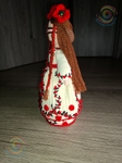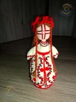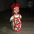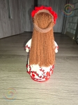 Напівбавовняна пряжа, наповнена холофайбером, намистини с бісеру. Стоїть самостійно.Перед вами постає сучасна Берегиня дому — лялька мотанка, створена з ниток і тиші, мов давній оберіг, що зберігає пам’ять роду. Хрест на обличчі, вишитий одяг і червоно-чорні візерунки символізують захист, силу життя та нерозривний зв’язок з українською традицією. У її статичній поставі відчувається спокій і гідність — ніби вона мовчки стоїть на варті дому й душі. Образ поєднує давню символіку з теплою фактурою ручної роботи, зберігаючи сакральний зміст і народну естетику. Це сучасне прочитання оберега, що несе захист, пам’ять роду й живий зв’язок із традицією.