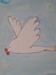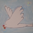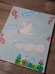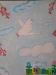 Дитяча авторська робота — Осєєва Діанна 9 років художниця з Запоріжжя - (створена 2025 ріку),На картині білий голуб миру летить у світлому небі, несучи в дзьобі червону ягідку — тихий символ любові й надії. М’які хмари та ніжне блакитне небо створюють відчуття легкості, а гілочки з червоними ягодами обрамляють простір, мов оберіг. Ця робота звучить як щире зізнання у любові до життя, де дитяча чистота образу поєднується з глибоким сенсом надії на мир.