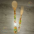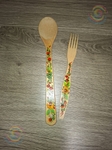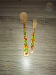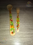 Дерев’яний набір з ложки та виделки, розмальовані у стилі петриківський розпис, вкриті лаком. Ширина ручки з розписом 2 смДерев’яний кухонний набір: ложка та виделка, які оздоблені ручним розписом у традиційному українському стилі, де соковиті квіти й ягоди розгортаються на теплому природному тлі дерева. Орнамент випромінює життєрадісність і достаток, перетворюючи повсякденні речі на естетичний акцент оселі. Це поєднання практичності й народного мистецтва, що зберігає дух традиції в сучасному побуті.