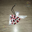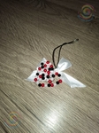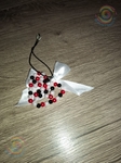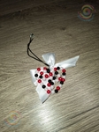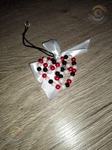 Виріб виконаний з білих, малинових і чорних пластикових намистин, акуратно закріплених на дроті та еластичному силіконовому шнурі. Срібляста фурнітура та атласна стрічка додає композиції завершеності й стриманого блиску. Перед вами витончене серце з чорних, малинових і перлинно-білих намистин, сплетених у вишуканий орнамент — мов застигла думка на межі світла й тіні. Білий атласний бант додає йому крихкої ніжності, немов тихий шепіт пам’яті, прив’язаний до цього малого, але промовистого символу. Чорний шнурок тягне вбік, наче дорога, якою це серце може вирушити до когось по-справжньому важливого місця.