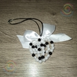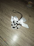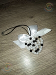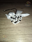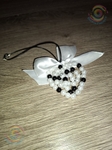 Виріб виконаний з білих і чорних пластикових намистин, акуратно закріплених на дроті та еластичному силіконовому шнурі. Срібляста фурнітура та атласна стрічка додає композиції завершеності й стриманого блиску. Перед вами витончене серце з чорних і перлинно-білих намистин, мов застигла думка між світлом і тінню. Білий атласний бант надає йому ніжності, немов тихий шепіт спогаду, прив’язаного до цього маленького символу. Чорний шнурок тягне вбік, наче дорога, якою це серце може вирушити до когось по-справжньому важливого місця.