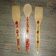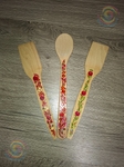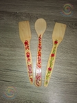 Дерев’яні столові прилади з ложки та 2-х лопаток, розмальовані у стилі петриківський розпис, вкриті лаком. Ширина ручки з розписом 2 см.Дерев'яні столові прилади: ложка та 2 лопатки, які прикрашені авторським розписом у духу українських народних традицій, де яскраві квіткові мотиви та ягоди оживають на природній фактурі дерева. Візерунок наповнює виріб теплом, радістю та символікою достатку, надаючи щоденному споживанню художньої цінності. Це гармонійне поєднання ужитковості й культурної спадщини, яке делікатно вписує традицію у сучасний простір будинку.